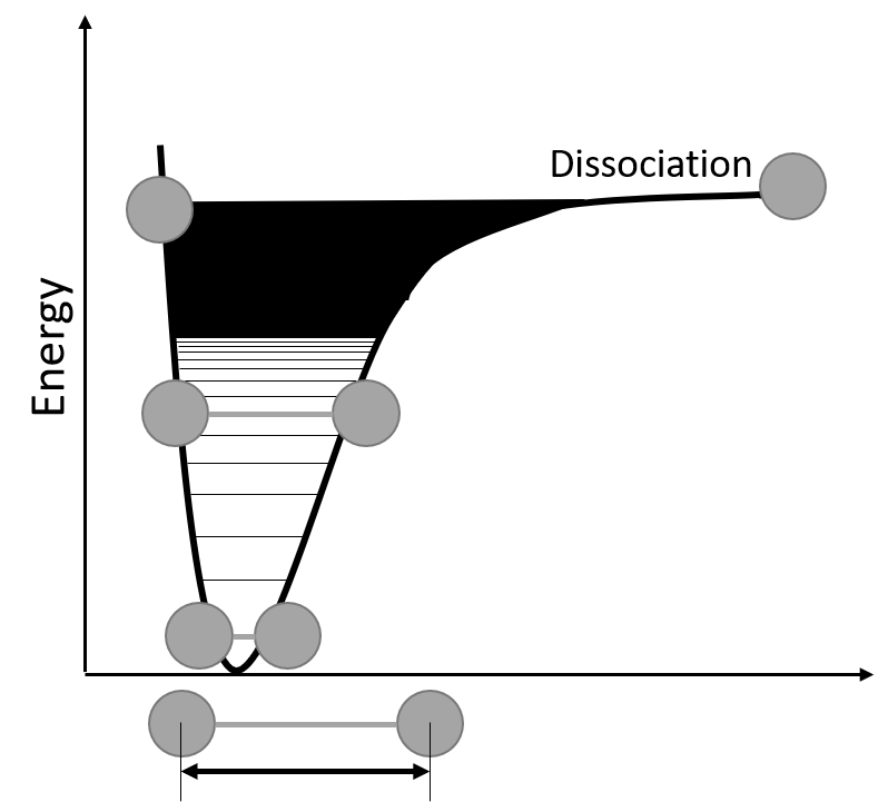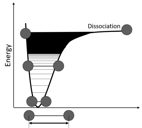 Eén van de mogelijke trucs maakt gebruik van het feit dat de atomen in een CO2-molecuul ten opzichte van elkaar kunnen trillen, alsof ze met een springveer met elkaar verbonden zijn. “Die trillingen vinden slechts plaats bij specifieke frequenties”, vertelt Ong. Elk type trilling heeft energieniveaus die je kunt voorstellen als treden van een ladder. Hoe hoger op de ladder, des te harder het molecuul trilt en des te minder energie het kost om een atoom los te maken uit het molecuul. Ze trillen als het ware kapot.