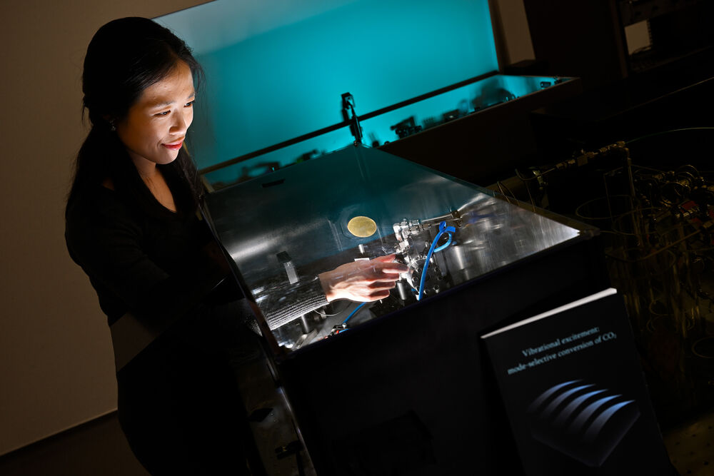 Chemie is soms gewoon moleculen slopen. In theorie kan dat door de moleculen zo hard te laten trillen dat ze breken. Promovenda Qin Ong liet zien dat je CO2 kunt omzetten naar CO door het met een infraroodlaser te beschijnen, met behulp van een mechanisme dat ‘ladderklimmen’ wordt genoemd. Mogelijk helpt dat in de toekomst zelfs om schone brandstoffen te maken.