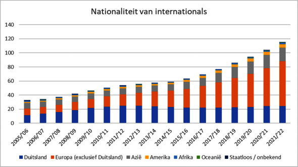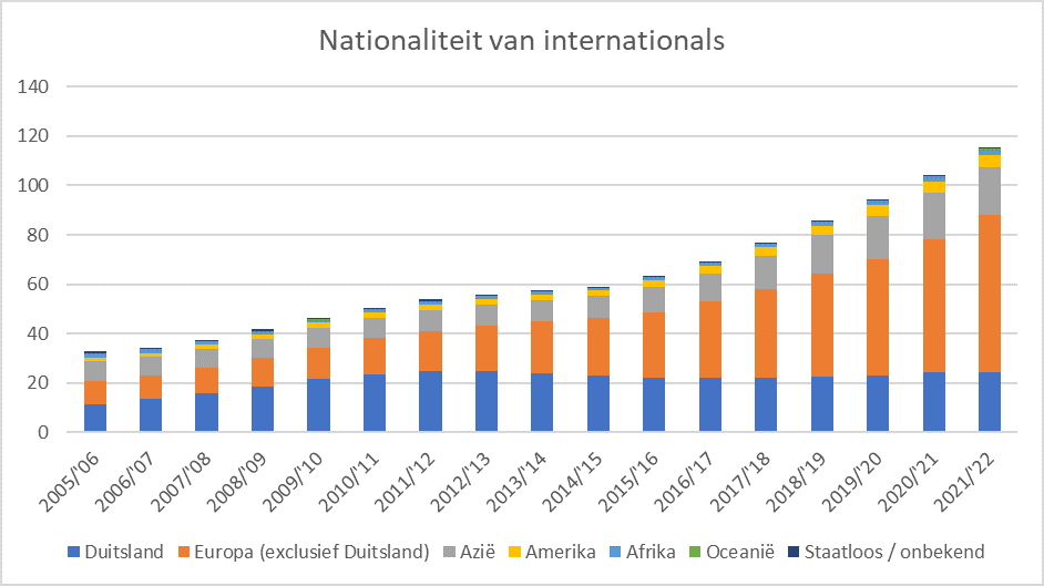 Ruim 42.000 van de 115.000 internationals studeren voor het eerst in Nederland. Dat is één op de vier eerstejaarsstudenten in het hoger onderwijs. Aan de universiteit komt 40 procent van de nieuwe studenten uit het buitenland.