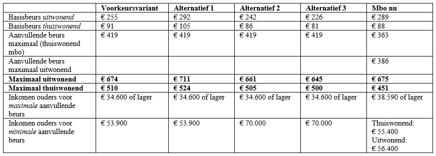 Uiteindelijk wil Dijkgraaf van 1 miljard euro dus een basisbeurs betalen plus enkele bijkomende maatregelen. Heeft de Tweede Kamer een andere voorkeur? Dijkgraaf heeft de opties in een schema gezet, met enkele tientjes meer of minder in de drie alternatieven.