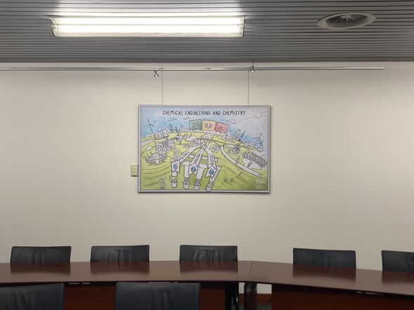 Op de schilderijen die toen tijdelijk als een parodie werden opgehangen, waren de seksen verwisseld. De togadragers waren nu vrouwen, terwijl de mannen er sexy bijstonden in crop tops. Volgens Amsing, die in september haar master afrondde bij Biomedical Engineering, “was tegelijkertijd geprobeerd om wat diversiteit toe te voegen wat huidskleur betreft”. De originele schilderijen zijn inmiddels verwijderd en vervangen door foto’s van mensen die aan het werk zijn in labopstellingen die te vinden zijn in Helix en een cartoon waarin de visie van de faculteit is weergegeven (zie de hoofdfoto en de foto direct hieronder).