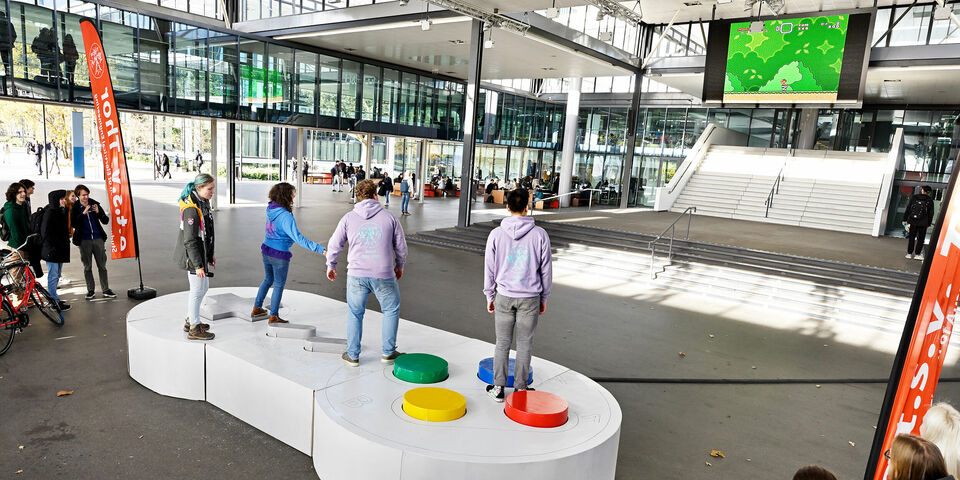 Het is maandagmorgen guur in de Markthal bij MetaForum, maar de Thor-leden weten zich prima warm te houden. Enthousiast springen ze op en neer op de knoppen van de enorme Nintendo-controller die zij hebben opgesteld voor het grote scherm boven de trap. Op dat scherm wordt de controller via een laptop aangesloten, zodat er tijdens de lunch gegamed kan worden.