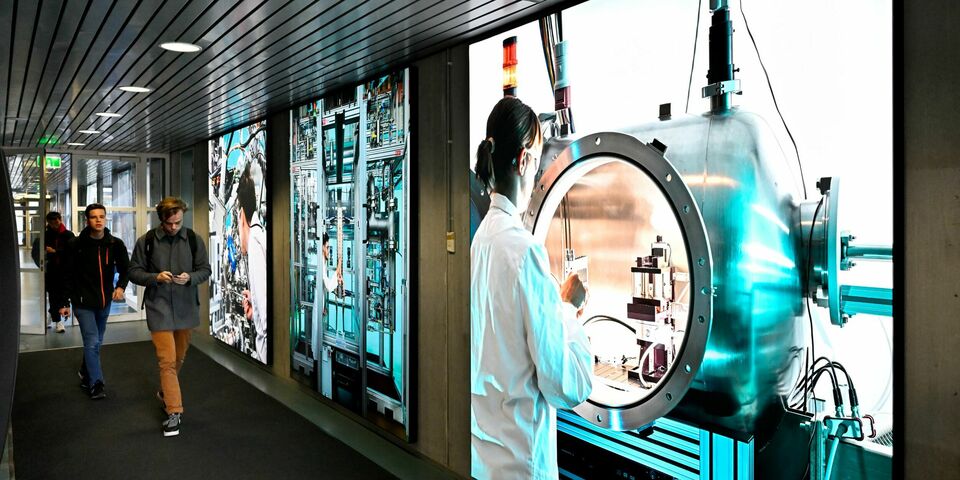 De Graef: “Overal door het gebouw werd nog eens extra schoongemaakt, want je wil je toch op de best mogelijke manier presenteren als zo’n commissie op bezoek komt. Het ophangen van de foto’s van de labopstellingen die in ons gebouw te vinden zijn, was er een wezenlijk onderdeel van.” Nijmeijer: “Het sluit aan bij wat vorige week werd gezegd tijdens de bijeenkomsten over de schaalvergroting: laten we hier aan de TU/e de bescheidenheid van ons afgooien en tonen waar we in excelleren en trots op zijn. Dat kun je nu zien op die foto’s, die overal in ons gebouw zijn opgehangen, dus ook in onze belangrijkste vergaderruimte: de Jan Pieter Minkelers Zaal.” Op de hoofdfoto is te zien hoe de entree van Helix er nu uitziet.