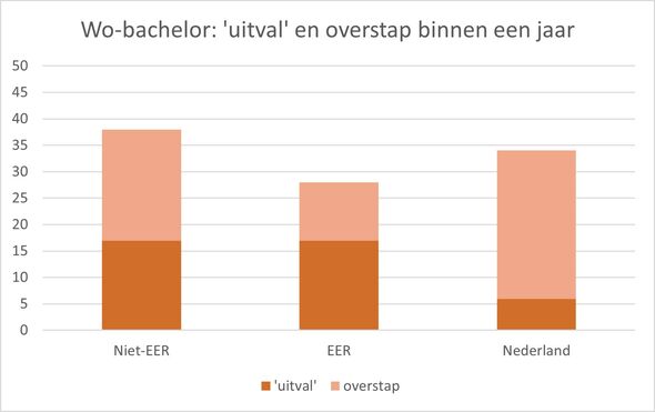Binnen een jaar blijkt 17 procent van de internationale studenten weer vertrokken. Daarin is geen verschil tussen studenten van binnen en buiten de Europese Economische Ruimte (EER). Misschien kiezen ze een opleiding in een ander land, maar daar zijn geen cijfers over. De inspectie noemt het ‘uitval’.