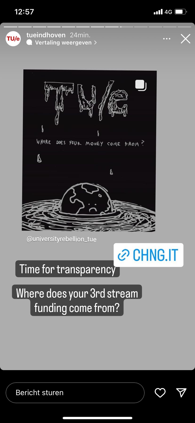 De berichten die University Rebellion heeft geplaatst op het Instagram account van de TU/e gingen over hun gelijk in de rechtszaak. Ook was het een roep om excuses van de universiteit evenals een oproep voor transparantie over de derdegeldstroom van de TU/e, met een link naar een petitie om dit voor elkaar te krijgen. De stories zijn allemaal tussen de 800 en 1200 keer bekeken voor ze zijn verwijderd door de universiteit.