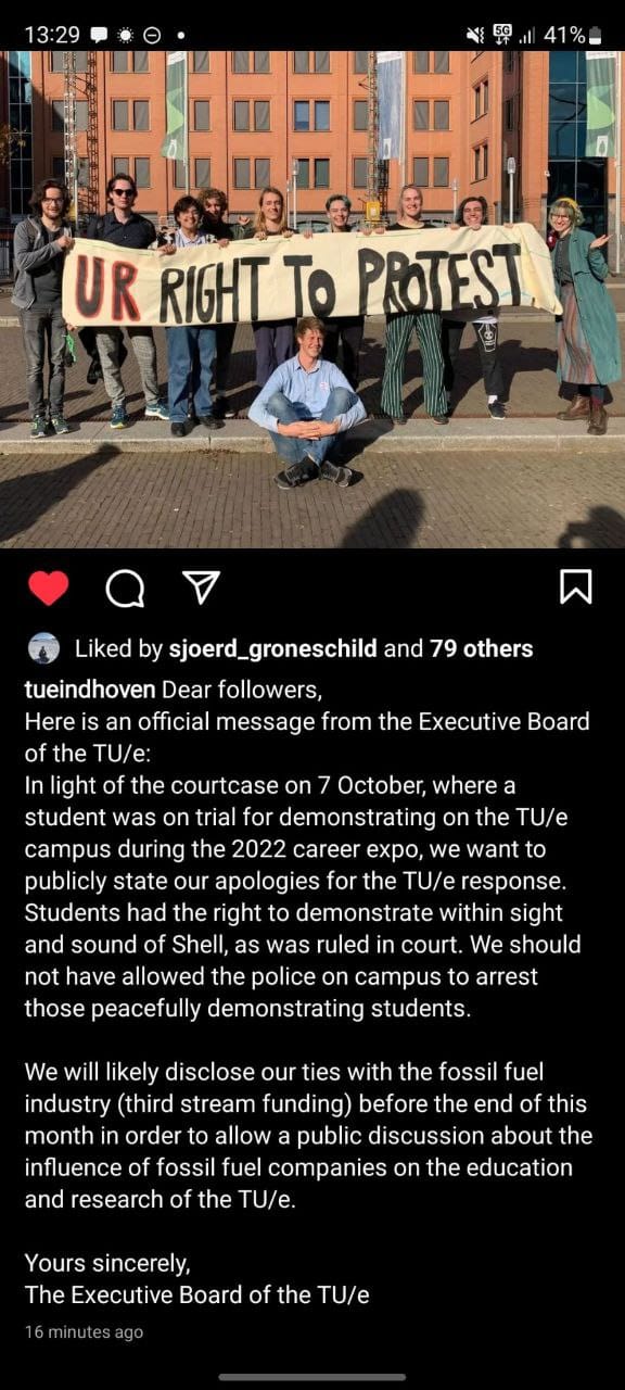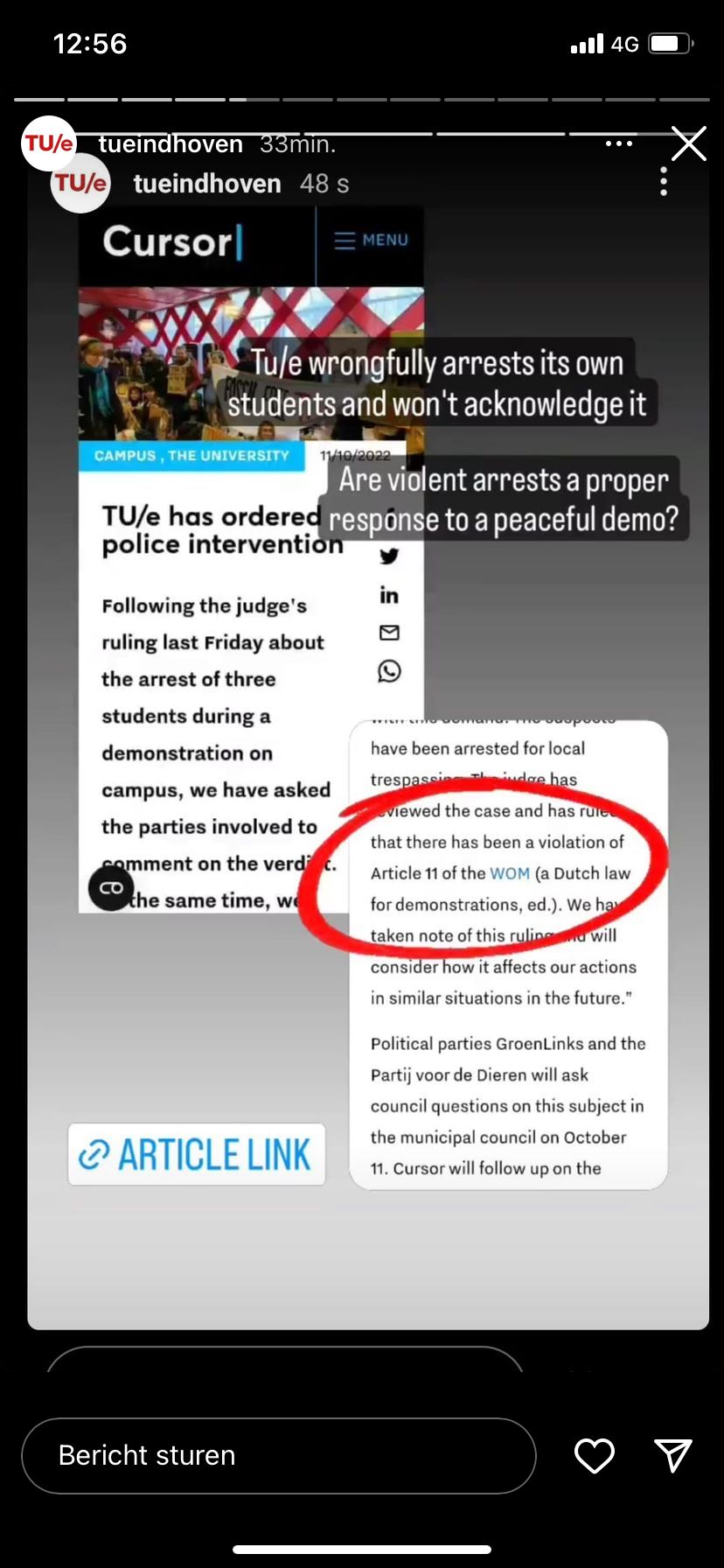 Op dinsdag 18 oktober is het Instagram account van de TU/e gehackt geweest. University Rebellion heeft weten in te breken in het account en heeft er eigen berichten op geplaatst namens de TU/e, waaronder een bericht van ‘het College van Bestuur’ met commentaar over de veroordeelde arrestaties in maart dit jaar.