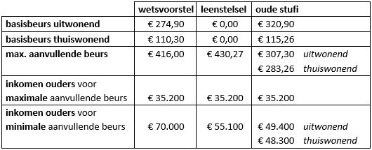 De bedragen verschillen enigszins van eerdere overzichten, maar het scheelt weinig. Alleen de maximale aanvullende beurs springt in het oog: daar komt 15 euro per maand bij, oftewel 180 euro per jaar.