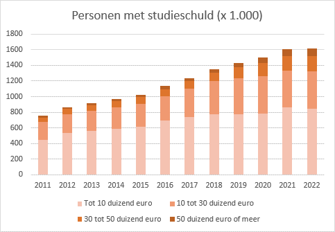 Dat blijkt uit nieuwe cijfers van het Centraal Bureau voor de Statistiek. Per september 2015 is de basisbeurs afgeschaft voor nieuwe studenten in het hoger onderwijs. De totale studieschuld was toen nog maar 12,7 miljard euro.