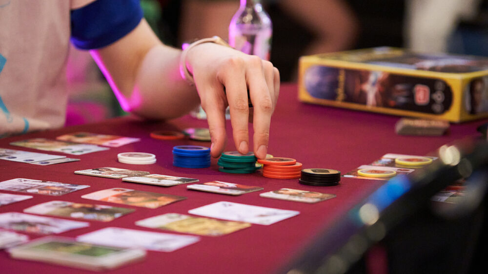 Ticket to Ride, Catan en Splendor; de foyer van bioscoop Lab 1 aan de Keizersgracht is een schatkamer voor bordspelletjesfanaten. Kastenvol met de nieuwste spellen staan tot beschikking. Deze donderdagavond zijn drie van de acht tafels waarop gespeeld wordt, bezet door introgangers.