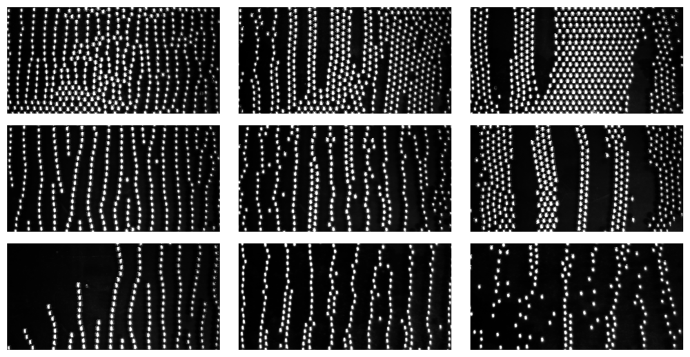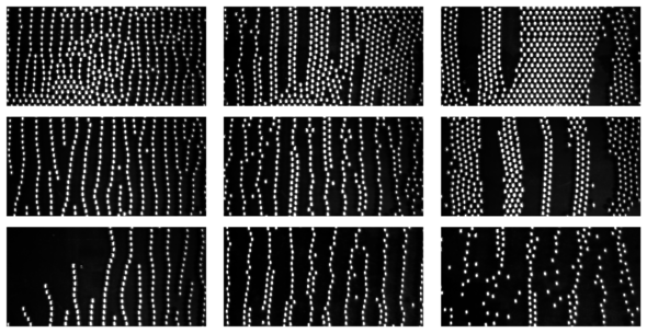 Zoals je in de natuurkunde wel vaker ‘een, twee, veel’ telt, was het ook voor Van Overveld de logische volgende stap om van twee deeltjes naar een handvol zand te gaan. Want hoe vertaalt zijn detailbeschrijving zich naar een groot patroon, en wat zijn daar dan precies de karakteristieken van? Voor studies met meer dan honderd deeltjes zijn simulaties niet geschikt, en daarom gooide Van Overveld honderden knikkers in een schuddende transparante waterbak. Met een camera erboven maakte hij video’s van wat er met de knikkers gebeurde. Zijn knikkervideo’s winnen uiteindelijk zelfs de Burgers Gallery van het J.M. Burgerscentrum, het landelijk onderzoeksinstituut Stromingsleer. “Magisch, al in een paar seconden vormt er zich een patroon. We hebben zo veel experimenten gedaan, waarbij we met alles varieerden waarmee we konden variëren. Grootte van de knikkers, aantallen, de frequentie en amplitude van het schudden.”