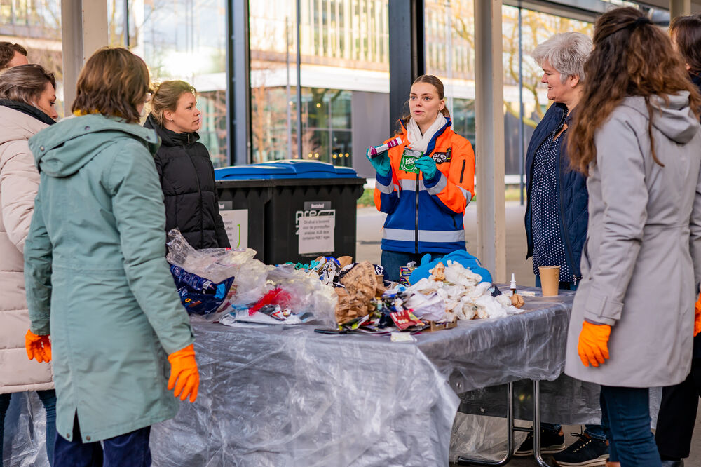 Geroutineerd houdt Céline Knubben, projectleider Zero Waste bij afvalverwerker PreZero, een grote vuilniszak ondersteboven. Om de tafel staan diverse TU/e-medewerkers – allen werkmatig of persoonlijk betrokken bij duurzaamheid – met stevige oranje handschoenen aan. We wachten op het startsein van Knubben, dan duikt iedereen op de berg om het afval in rap tempo te categoriseren. “Laatst vonden we een halfvolle bak eten van de Chinees, echt geen succes zo vroeg in de ochtend,” gruwelt een van de deelnemers met opgetrokken neus.