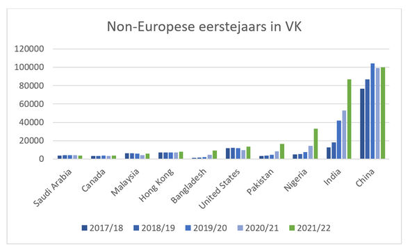 Bovendien beginnen er al enkele jaren rond de honderdduizend Chinese studenten aan een opleiding in het Britse hoger onderwijs. De toestroom uit India is omhoog geschoten van 53.000 naar 87.000 eerstejaars.