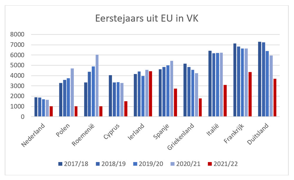 Uit Nederland, Polen en Roemenië kwamen in 2021 evenveel studenten, blijkt uit de data: om precies te zijn 1.015. Dat is puur toeval, zegt een medewerker van HESA, het Britse statistiekbureau voor het hoger onderwijs. De data worden overigens afgerond op vijftallen.