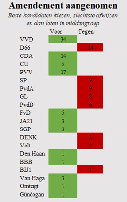 Over het wetsvoorstel zelf is nog niet gestemd. Na dit amendement wil de PvdA even nadenken. Eigenlijk is de partij blij met de terugkeer van loting, maar misschien niet op deze manier. De stemming is uitgesteld tot volgende week.