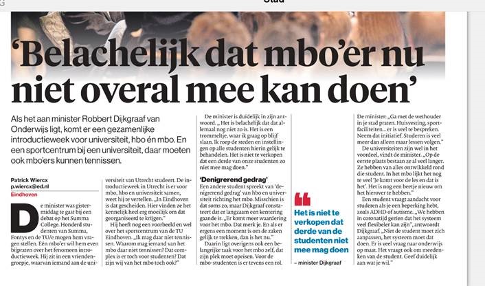 Een mbo-student krijgt meer begrip van de minister. “Als Eindhovense mbo’er mag ik niet naar de Intro en niet tennissen bij het Studentensportcentrum. Wat kunt u daaraan doen?” Het is eigenlijk een vorm van discriminatie, vindt Dijkgraaf. “Het is belachelijk, het lijkt discriminatie op basis van opleidingsniveau. Ik kan oproepen alle studenten gelijk te behandelen. Het is een principieel punt, waarom kunnen studenten wel samen een zonnewagen maken en niet samen sporten?”