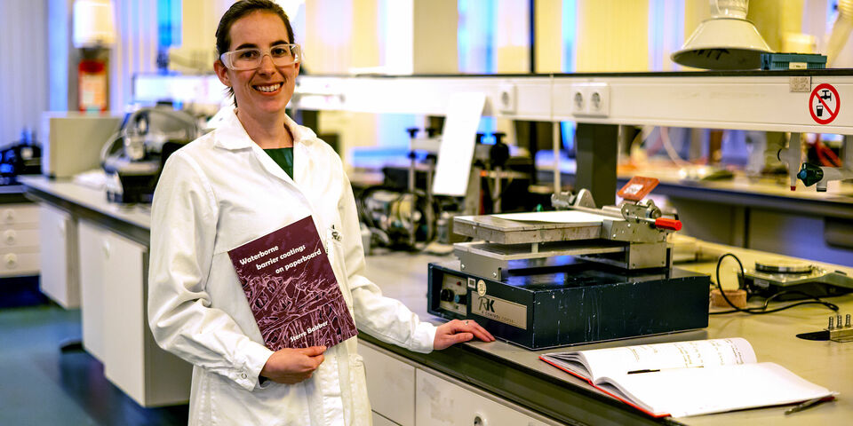 Bakker onderzocht tijdens haar promotietraject hoe karton ingezet kan worden om voedselverpakkingen te verduurzamen; en komende vrijdag verdedigt ze haar proefschrift aan de faculteit Chemical Engineering and Chemistry. Om ook daadwerkelijk een brug tussen labtafel en verpakkingsfabrikant te slaan, werkte ze samen met chemieconcern BASF.