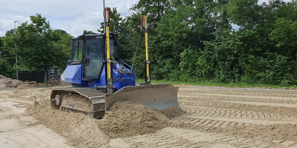 Zijn collega zit op een shovel en schuift het gele zand vlak (zie hoofdfoto). Er komt daarna 8 centimeter lava op en een foamlaag vóór de kunstgrasmat kan worden gelegd. “Daarmee zijn we er nog niet. Tijdens wedstrijden moet water worden gespoten en daarom moeten we ook waterleidingen aanleggen die de sproeiers kunnen voeden”, zegt de aannemer.