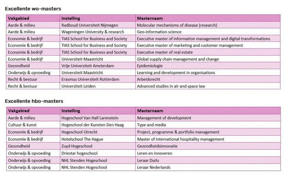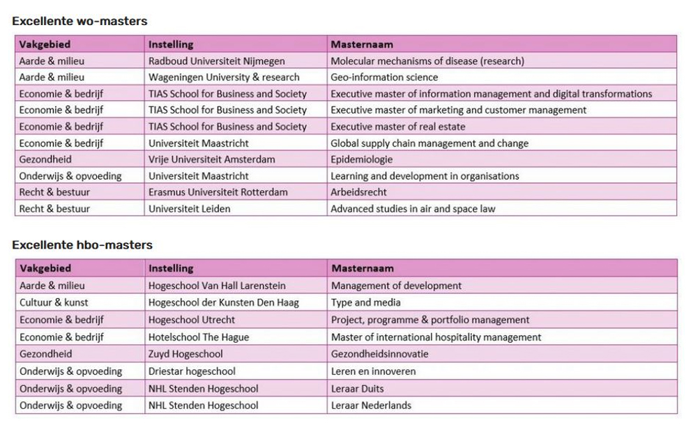 Afgaand op het lijstje met excellente masters doet de particuliere TIAS School for Business and Society goed mee in het wo. In het hbo scoren de lerarenopleidingen Duits en Nederlands van NHL Stenden maximaal.