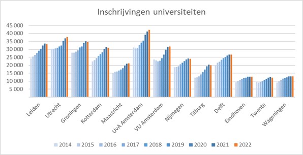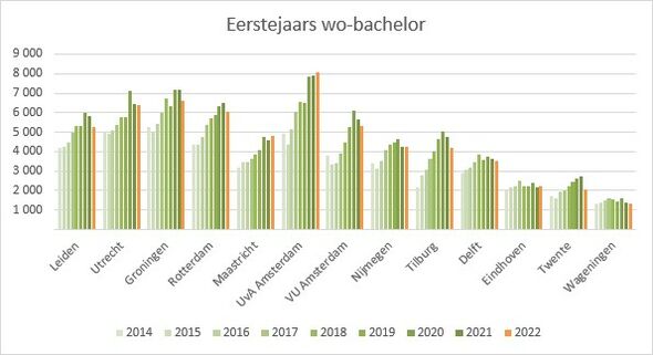 Dit studiejaar begonnen er zestigduizend studenten aan een wo-bacheloropleiding. De masteropleidingen trokken ruim vijftigduizend nieuwe studenten. Alles bij elkaar zijn er enkele duizenden eerstejaars studenten minder dan in 2021/2022.