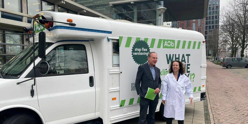 Dinsdagmiddag stapte AOb-voorzitter Tamar van Gelder uit haar witgroene ‘anti-flexbus’ voor de hoofdingang van de Amsterdamse Vrije Universiteit (VU). In een witte doktersjas van de voor de gelegenheid in het leven geroepen mobiele afkickkliniek ‘Whattheflex!?’ overhandigde ze een zelfhulpboek aan collegevoorzitter Marcel Nollen.