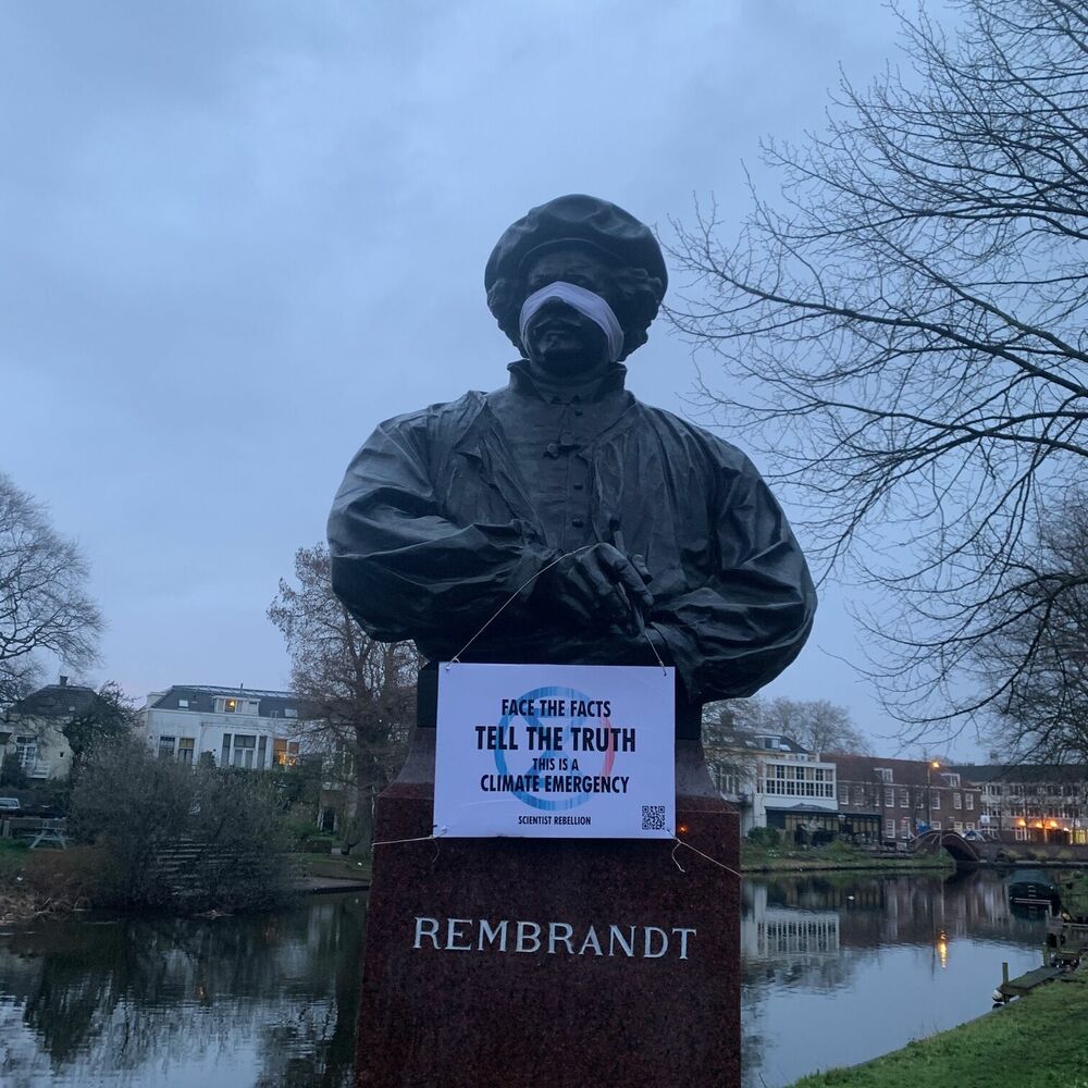 Tien klimaatactievoerders van Scientist Rebellion hebben dit weekend onder meer de standbeelden van Erasmus in Rotterdam, Spinoza in Amsterdam en Rembrandt in Leiden geblinddoekt. Het zou gaan om ten minste acht standbeelden in Nederland.