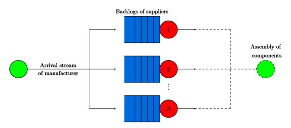 Schol hield zich in zijn onderzoek bezig met een specifiek wachtrijmodel, de zogenaamde fork-join queue die – zoals de naam doet vermoeden – op basis van twee principes werkt: verdelen en samenvoegen (zie ook de figuur hieronder). In dit systeem worden de binnenkomende taken verdeeld in subtaken die tegelijkertijd door verschillende servers worden uitgevoerd en aan het einde van het proces weer worden samengevoegd. De snelheid van de traagste server bepaalt daarbij logischerwijs hoe snel de hele taak wordt uitgevoerd.