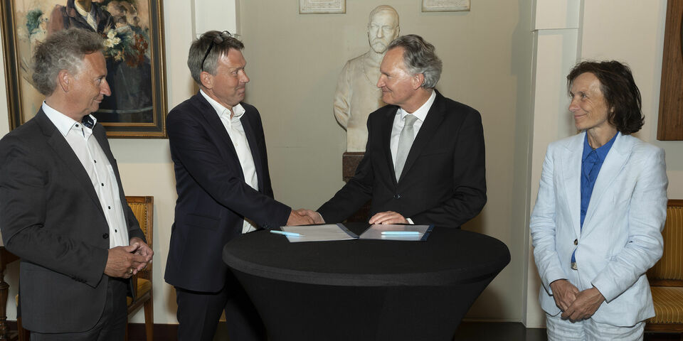Op de hoofdfoto van links naar rechts: Maurice Geraerts, executive director NXP Netherlands, Lars Reger, vice-president NXP, collegevoorzitter Robert-Jan Smits en Silvia Lenaerts, sinds 11 mei de nieuwe rector van de TU/e.