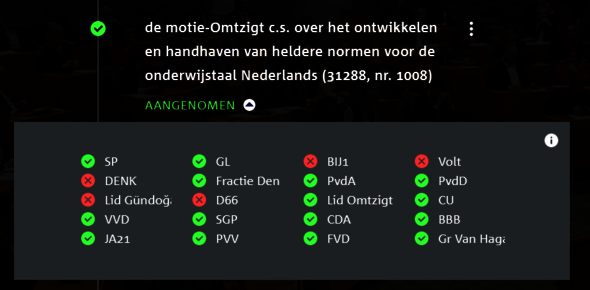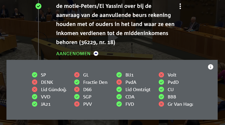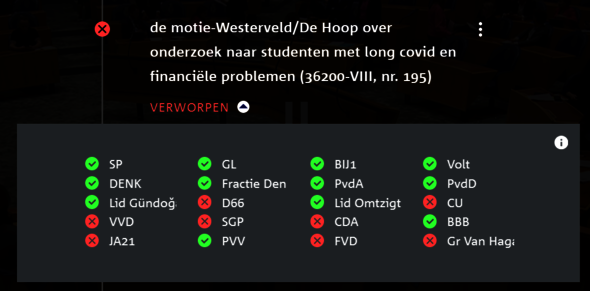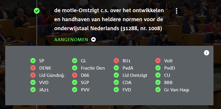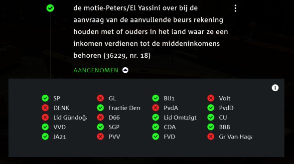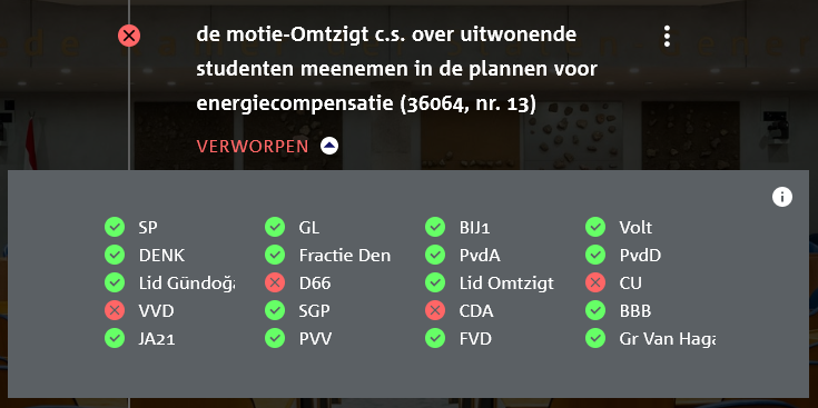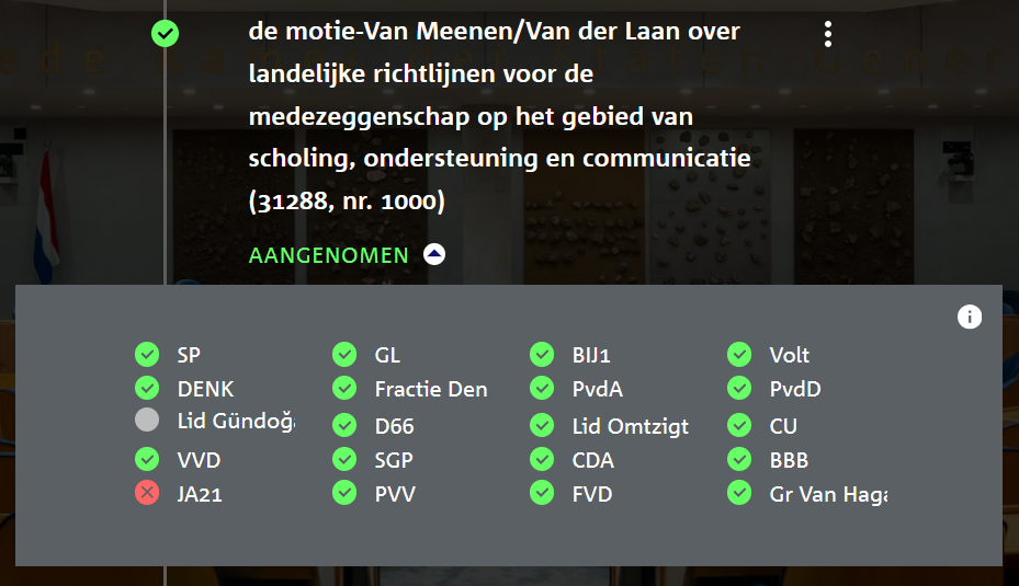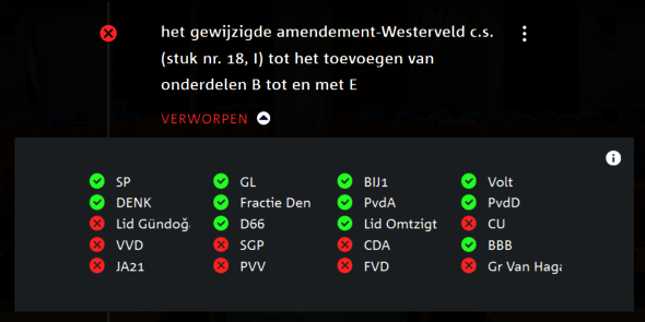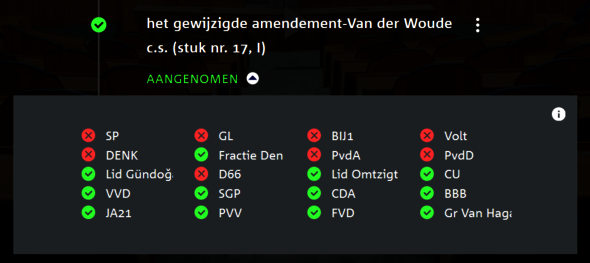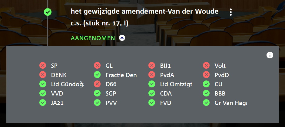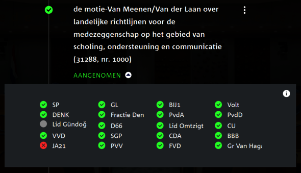 Een grijs bolletje betekent afwezigheid bij de stemmingen. Bij1 zou deze motie ongetwijfeld gesteund hebben. Ook BBB en Omtzigt waren voor deze motie, maar die hebben beiden slechts één zetel.