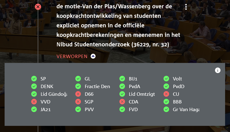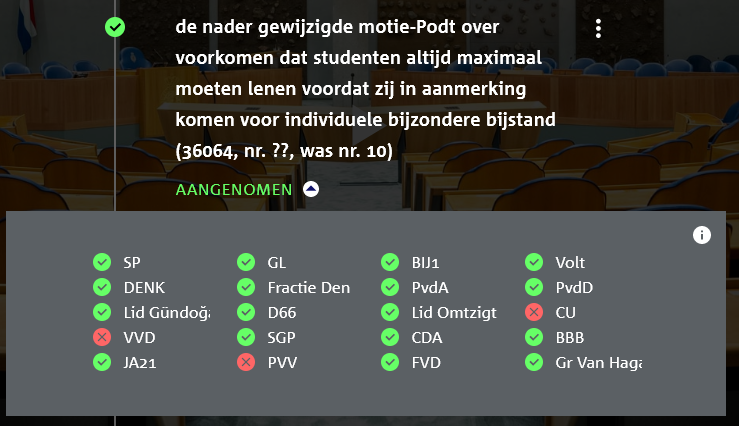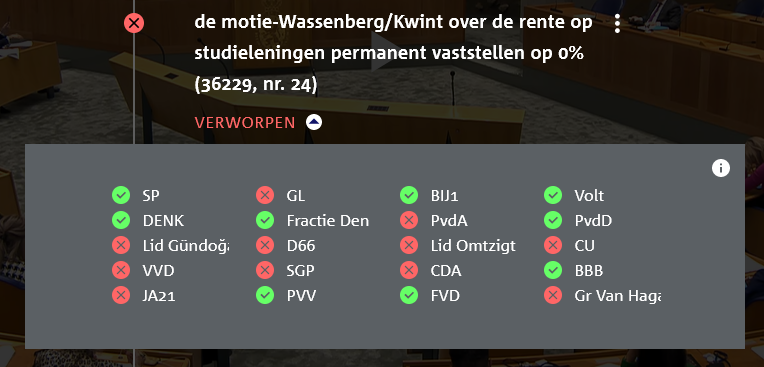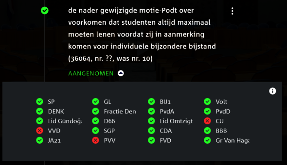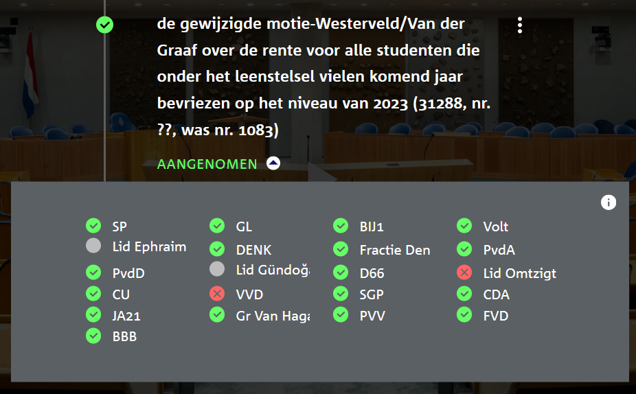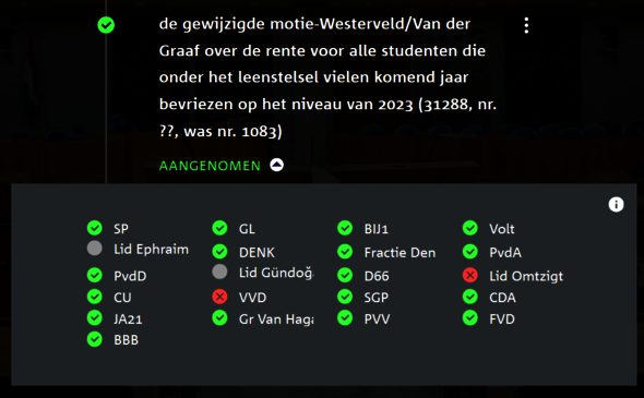 “…verzoekt de regering om de rente voor alle studenten die onder het leenstelsel vielen komend jaar te bevriezen op het niveau van 2023…”