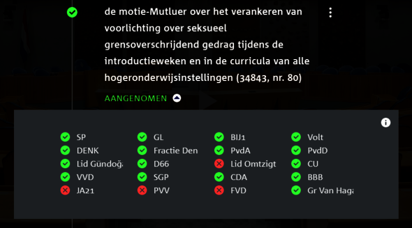 “… verzoekt de regering om … te verkennen hoe de voorlichting aan studenten en medewerkers over seksueel grensoverschrijdend gedrag verankerd kan worden tijdens de introductieweken en in de curricula van alle hogeronderwijsinstellingen…”