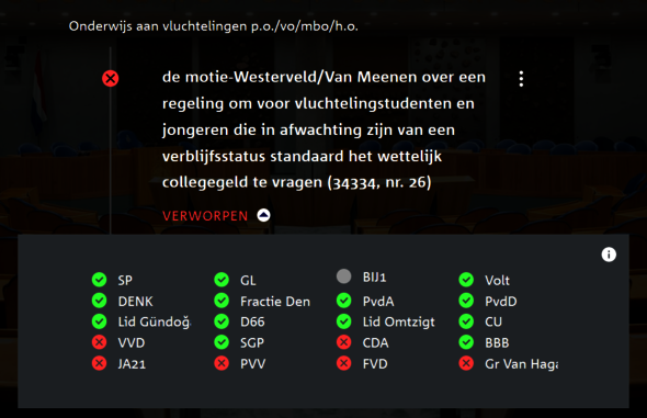 “… verzoekt de regering om … een regeling te treffen waardoor voor vluchtelingstudenten en jongeren die in afwachting zijn van een verblijfsstatus standaard het wettelijk collegegeld wordt gevraagd…”