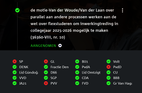 “… constaterende dat de wet er nog niet ligt, waardoor nieuwe studenten volgend jaar niet zullen kunnen flexstuderen; … verzoekt het kabinet om … inwerkingtreding in collegejaar 2025-2026 mogelijk te maken…”