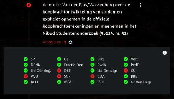 In de Tweede Kamer maken politieke partijen voortdurend keuzes voor of tegen bepaalde moties en amendementen. In de aanloop naar de verkiezingen van 22 november kijken we hoe ze hebben gestemd over kwesties die studenten raken.