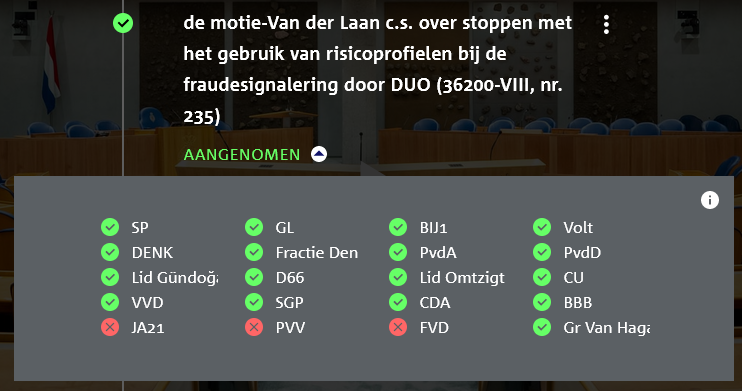“… verzoekt de regering om totdat meer duidelijk is over de werkwijze van DUO de fraudesignalering te beperken tot steekproeven en te stoppen met het gebruik van risicoprofielen…”