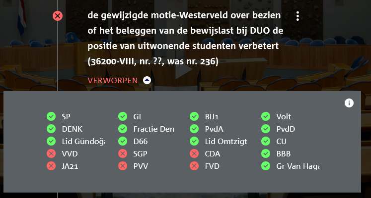 Over de selectie van motie en amendementen: we hebben vooral, maar niet uitsluitend, gekeken naar stemmingen die de vier coalitiepartijen VVD, D66, CDA en ChristenUnie verdeelden. Vaak stemden ze immers als één blok, vanwege de compromissen in het regeerakkoord, en dan kun je hun eigen mening minder goed zien. Dat geldt bijvoorbeeld voor de terugkeer van de basisbeurs en de compensatie voor pechstudenten: oppositiepartijen wilden meer, terwijl de regeringspartijen de rijen gesloten hielden. Zulke onderwerpen hebben we overgeslagen.