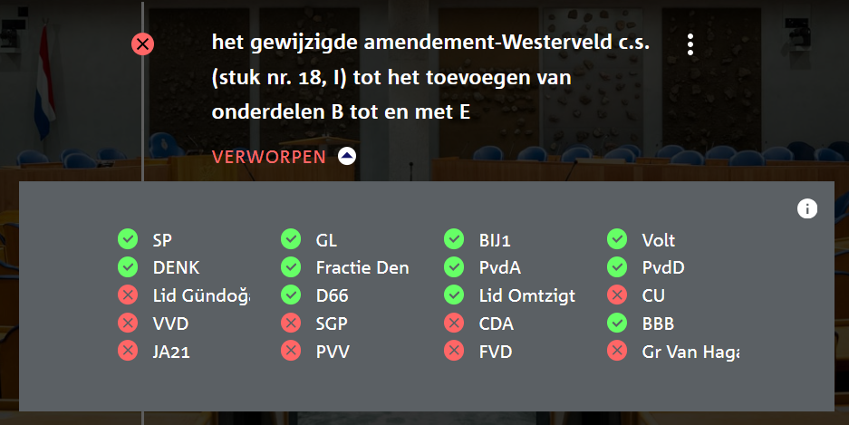 Deze motie haalde het niet, maar kreeg steun van grote en kleine partijen zowel links als rechts van de coalitie.