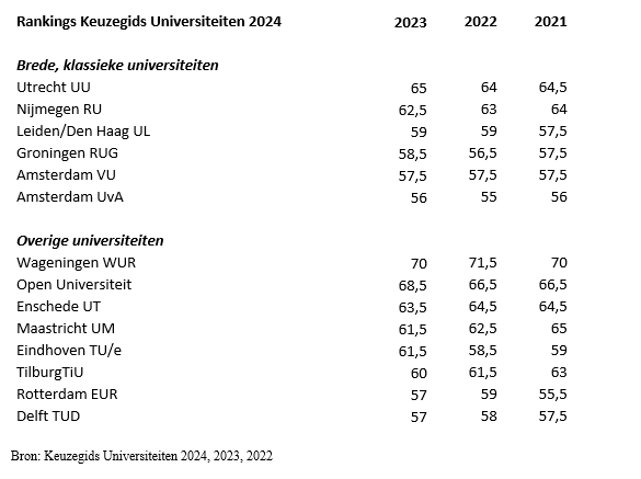 In de ranglijst van universiteiten met de beste bacheloropleidingen is Utrecht opnieuw de nummer één van de ‘brede’ universiteiten. De voorsprong op de Radboud Universiteit Nijmegen en de Universiteit Leiden is dit jaar wat groter. De Universiteit van Amsterdam is wederom hekkensluiter.