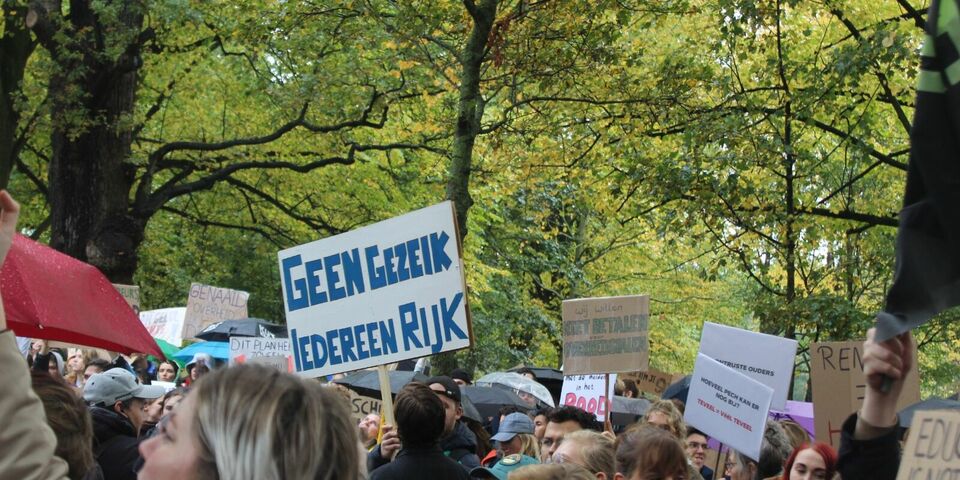 Voor het tijdelijke Tweede Kamergebouw verzamelen zich rond twee uur een paar honderd demonstranten. Piepjonge eerstejaars maar ook langstudeerders, millenials met torenhoge schulden en zelfs ‘bezorgde ouders’. Ze zien de rentestijging als de zoveelste klap in het gezicht van een generatie studenten “die al te vaak genaaid is”.