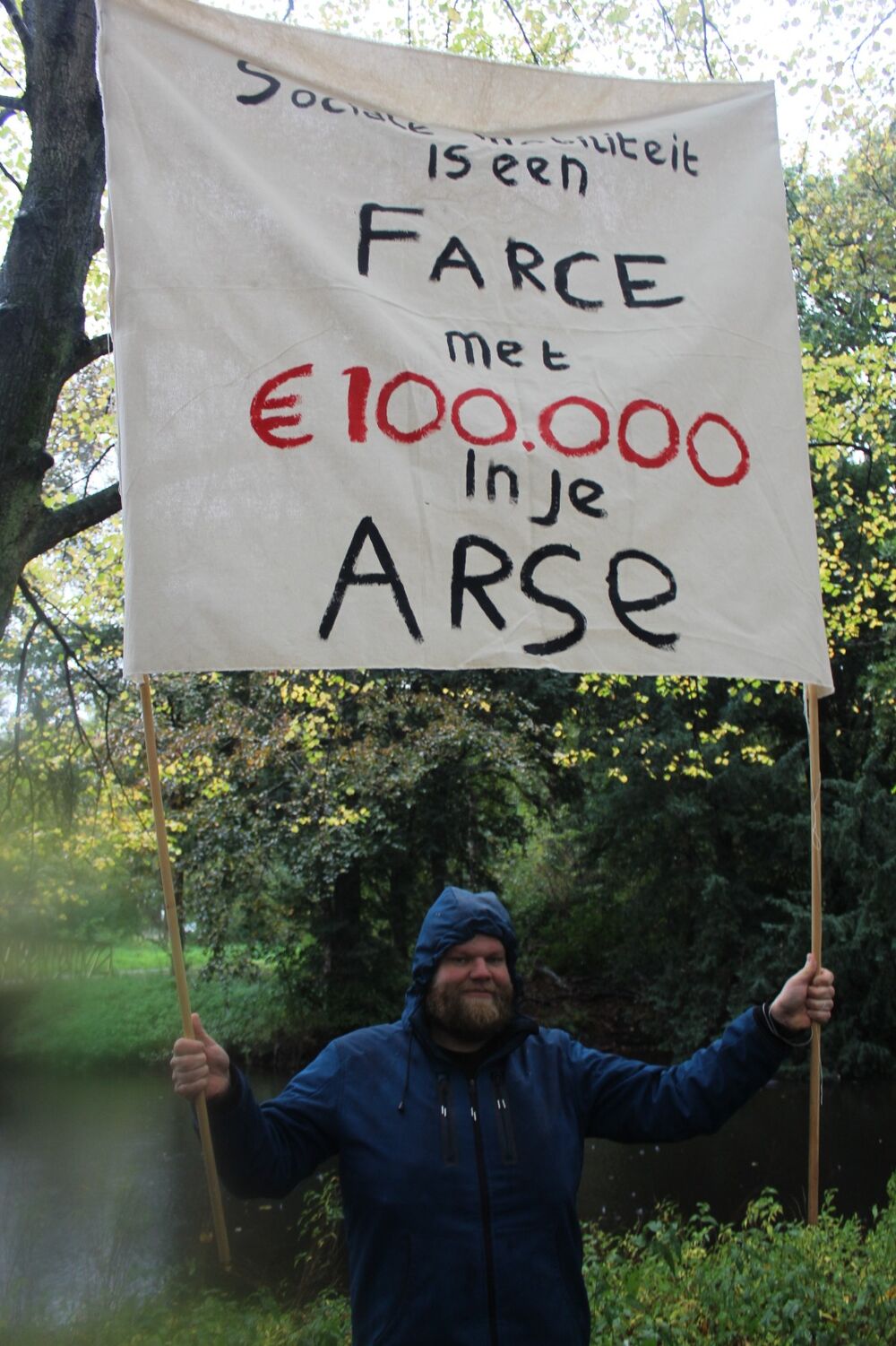 De Utrechtse afgestudeerde kunststudent Reinier (35) loopt met een spandoek met de tekst: “Sociale mobiliteit is een farce met 100.000 euro in je arse”. Hij moest in zijn studententijd veel bijlenen vanwege een ziekte, zegt hij. “Over die renteverhoging was ik echt verbaasd, ik kan die echt niet betalen.” Had hij niet minder kunnen lenen? “Nou ja, destijds had ik het echt nodig.” Maar de terugbetaalvoorwaarden zijn toch sociaal? “Zo voelt dat niet. Ik moet maandelijks honderden euro’s aflossen, terwijl ik niet fulltime kan werken.”