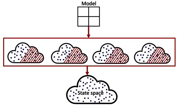 En dus moest de toestandsruimte kleiner. Bouwman pakt een vel papier en zet dat vol kleine stippen. Vervolgens deelt hij de grote wolk in vieren, en streept binnen de kleinere wolken een flink aantal stippen weg. “Door het model te fragmenteren konden we wel berekeningen uitvoeren en zo de toestandsruimte van elk component verkleinen. Vervolgens voegden we de geminimaliseerde delen weer samen tot een geheel. Erg belangrijk, want uiteindelijk wil je eisen checken die over het hele systeem gaan; wanneer een wissel van positie verandert zijn daar vele sensoren en componenten bij betrokken.”