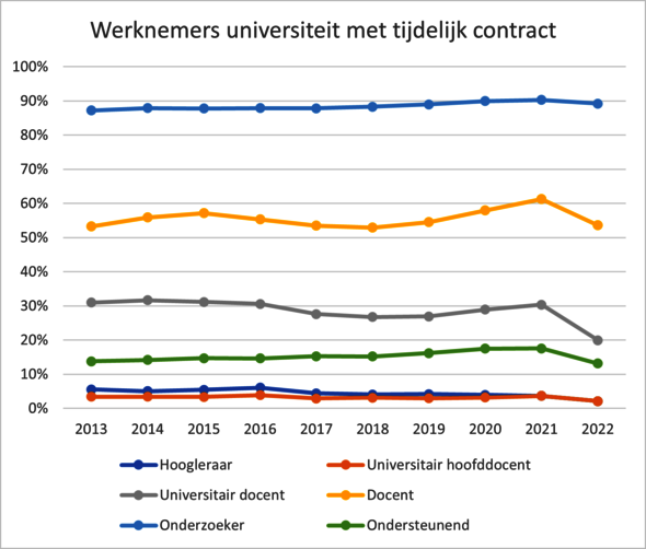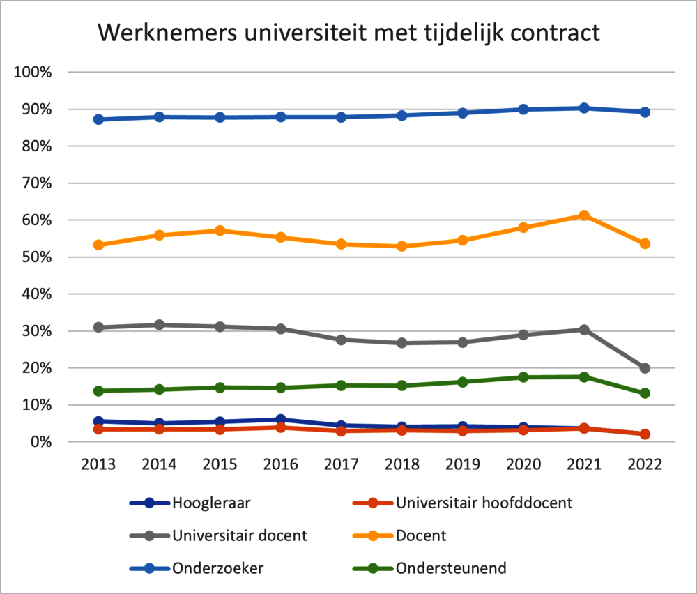Ook de ‘universitair docenten’ (UD’s) werken nu beduidend minder vaak op een tijdelijk contract (29 in plaats van 19 procent). Ook het ondersteunend personeel heeft nu iets vaker een vaste baan.