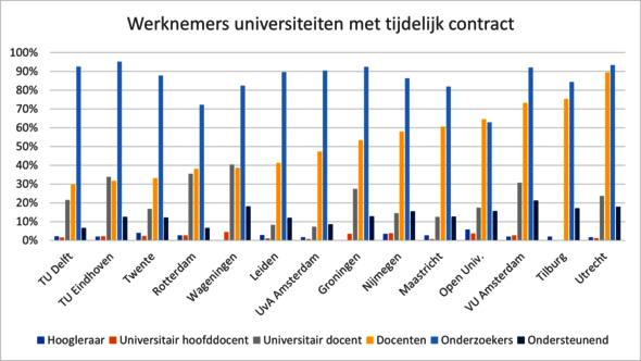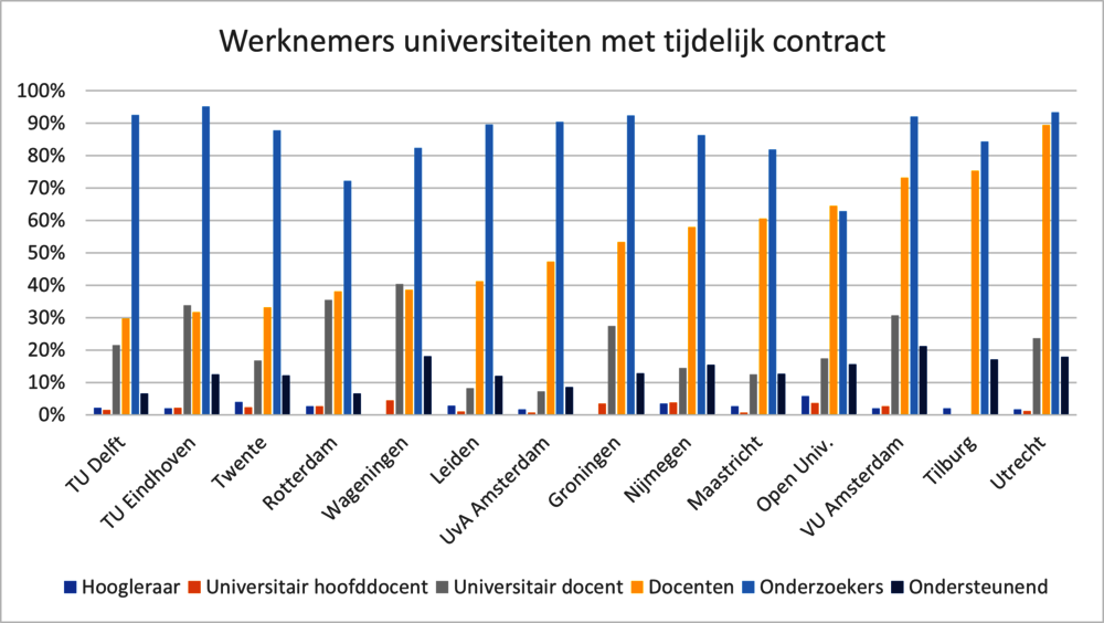 Maar de verschillen tussen de universiteiten zijn nog altijd enorm. In Delft heeft 30 procent van de ‘docenten’ een tijdelijk contract, tegen 89 procent aan de Universiteit Utrecht. In Wageningen heeft 40 procent van de universitair docenten een tijdelijk contract, in Tilburg is dat volgens de nieuwste tabellen nul procent.