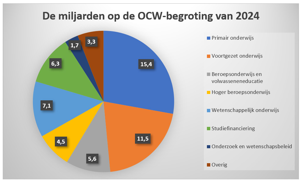 Het primair en voortgezet onderwijs beslaan bijna de helft van de totale OCW-begroting. Het hoger onderwijs en onderzoek zijn goed voor ruim een kwart van de uitgaven. Nog eens zo’n 11 procent is voor de studiefinanciering.