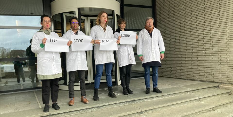 Ze probeerden het college van bestuur gistermiddag letterlijk terug te fluiten. Met scheidsrechterfluitjes (en oordoppen) stonden vijf wetenschappers van de Universiteit Twente vandaag voor het raam van het college van bestuur. “Stop de KLM-lobby”, was de boodschap aan hun bestuurders.