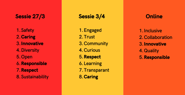 Tijdens die tweede break-outsessie worden de tien hoogst gescoorde termen (uit de lijst met twintig potentiële kernwaarden) nader besproken. Ieder groepje krijgt twee of drie van deze termen toegewezen die veel overlap met elkaar hebben. De groepen dienen deze termen, waar mogelijk, samen te voegen en te herformuleren tot een term die beter past als potentiële kernwaarde. Een groep kreeg bijvoorbeeld de twee termen: ‘collaboration’ en ‘partnership’ en deze werden samengevoegd tot ‘collaborative’.