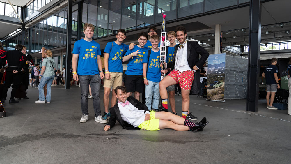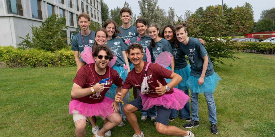 Een lopende cantus, dat is dit groepje van Mechanical Engineering. De mentoren dragen beide een (half) rokkostuum. “Gisteren waren we in compleet rokkostuum, maar het is traditie dat mentoren na de case op dinsdag het water in gaan, dus hebben we vandaag zwembroeken aangedaan”, aldus één van de mentoren. Een van de eerstejaars draagt een staf, waar na openklappen twaalf biertjes in passen. De staf is een lichtere versie van een houten balk die de mentoren twee jaar geleden ronddroegen op de Intro en waar één van de twee een cyste in zijn linkerschouder aan overhield.