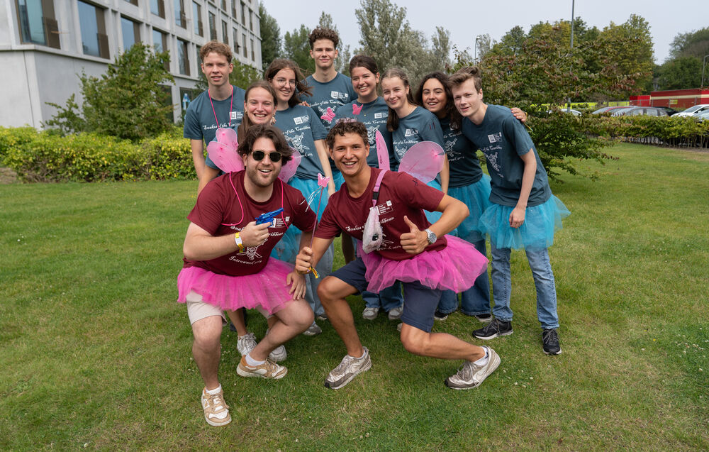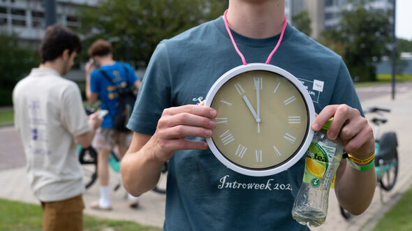 Een bos ontbreekt nog, maar deze BMT-elfjes voelen zich ook prima thuis op de campus. De Intro-ouders zijn behangen met extra tools: een toverstaf voor de nodige magie en een waterpistool als er een kiddo bij de les moet worden gehouden. Een van de kiddo’s draagt een aardig formaat klok om zijn nek. Waarom? Om hem te herinneren aan het belang van op tijd komen. Die klok zelf gaat hem daar niet bij helpen; de batterij is op magische wijze verdwenen.