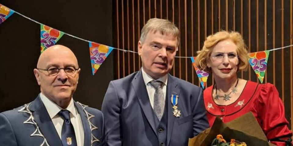 Echtgenote Liesbeth nam Kuipers mee naar de Zwarte Doos om er zijn 25-jarig jubileum als hoogleraar te vieren. Tot zijn verrassing spelde burgemeester Kees van Rooij van gemeente Meierijstad hem daar een lintje op.