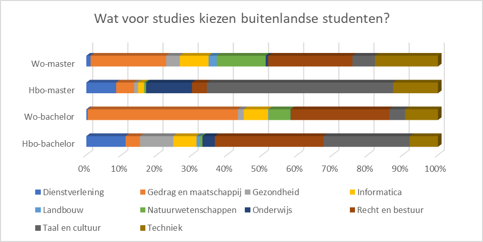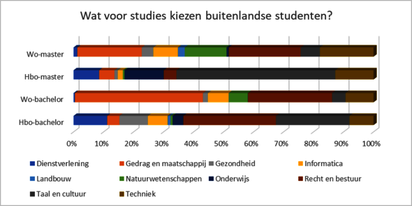 Ook bij hogescholen zijn techniek en IT niet erg populair onder buitenlandse studenten. Slechts 15 procent van de buitenlandse bachelor- en masters studeert aan deze opleidingen. Dat zoveel buitenlandse studenten een opleiding in de taal en cultuur volgen, heeft onder meer te maken met de zeer internationaal georiënteerde kunstopleidingen en conservatoria.