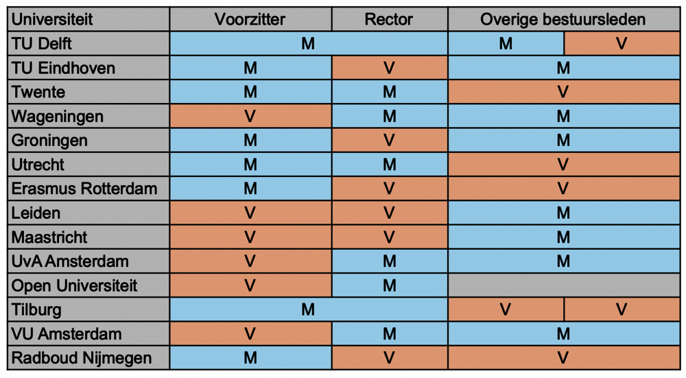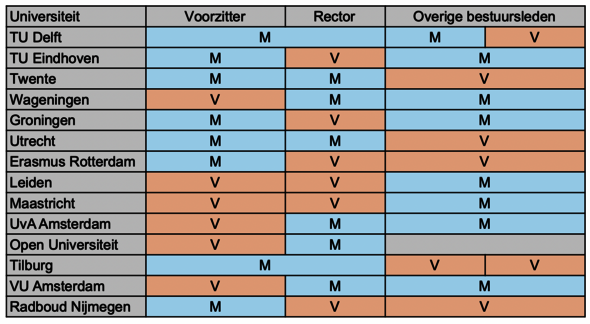 Zes van de veertien universiteiten hebben een vrouwelijke voorzitter en eveneens zes een vrouwelijke rector, zo ook op de TU/e waar Silvia Lenaerts de functie van rector vervult. In totaal tellen de besturen negentien vrouwen en 22 mannen. Van de acht mannelijke voorzitters zijn er twee tevens rector.